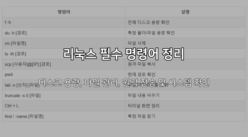 리눅스를 사용하다 보면 디스크 용량 확인, 파일 및 폴더 관리, 원격 서버 파일 전송 등 다양한 작업을 수행해야 할 때가 있습니다. 이 글에서는 실무에서 자주 사용했던 명령어들 위주로 정리해두었습니다. 특히나 파일 관련 내용이나 원격전송등은 상황에 따라 사용 빈도가 높으나 생각날때 찾아보면 명령어 찾기가 생각보다 어려운 경우가 많아 따로 정리했습니다.
