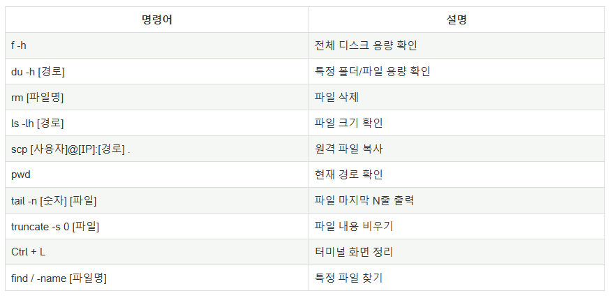 | du -h [경로] | 특정 폴더/파일 용량 확인 |