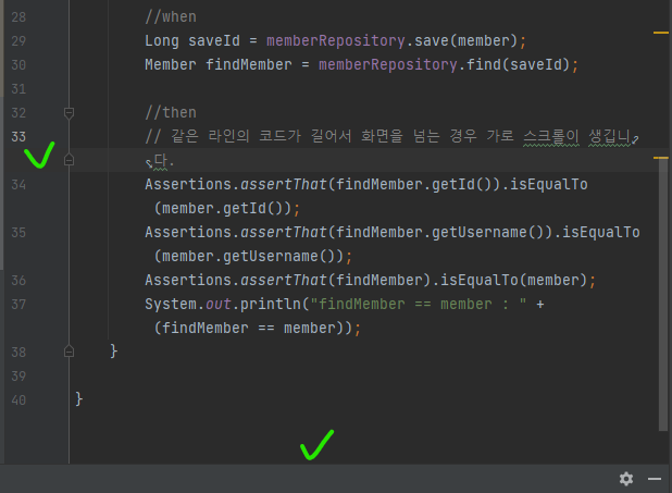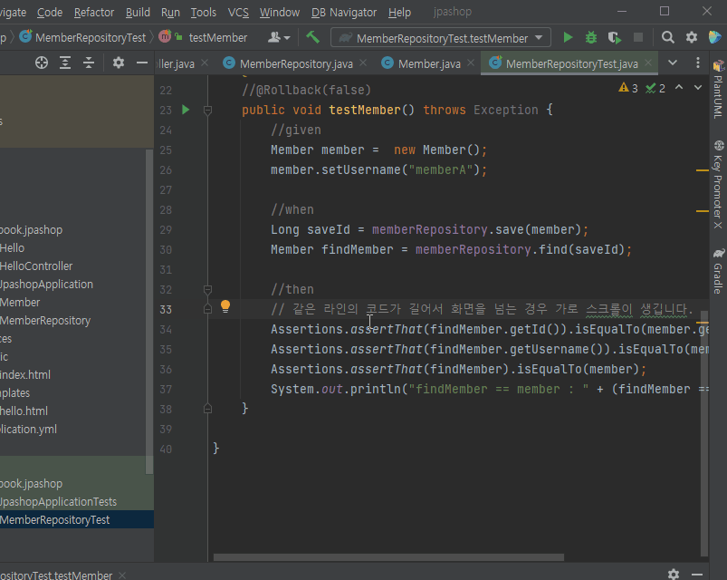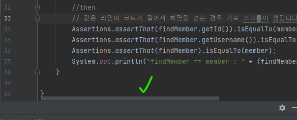 Soft-Wrap이 적용되지 않은 화면은 위와 같이 화면크기보다 라인이 길어지면 아래화면처럼 가로 스크롤이 생기게 됩니다. Soft-Wrap은 인텔리제이에서만 있는 기능은 아니고 글이나 코드 등의 텍스트 문서에서 행이 너무 길어 화면에 다 보이지 않을 때, 행을 자동으로 개행해주는 기능입니다.
