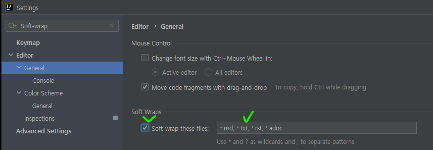 Settings 메뉴 > Editor > General > Soft Wraps에 들어가면 특정 파일 포맷에 적용할 수 있는 항목이 보입니다. 위 화면에서 체크해둔 체크박스를 클릭해주시고 오른쪽에서 적용할 확장자명을 지정할 수 있습니다. 해당 입력칸은 정규식이 적용되기 때문에 알맞은 정규식으로 확장자별로 Soft-Wrap을 지정할 수 있습니다.