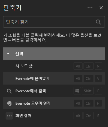 에버노트(Evernote)라는 텍스트 편집기를 사용하는데, 에버노트는 아래와 같이 전역 단축키를 제공한다. 전역 단축키라는건 해당 어플리케이션을 활성한 상태에서만 적용되는 것이 아니라 윈도우 전체에서 적용되는 단축키를 말한다.