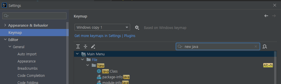 New Java Class는 단축키가 매핑되어 있지 않은 기능인데 단축키 세팅에 들어가면 볼 수 있다. 어플리케이션 처음에 구축하는 시점에는 자바 클래스를 새로 생성하는 경우가 많기 때문에 단축키를 적당하게 매핑해서 사용하면 생산성을 올릴 수 있다. 추천하는 단축키는 윈도우 기준 alt + N이다.