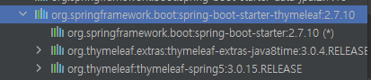 스프링 부트에서 thymeleaf를 사용할때 요렇게 spring-boot-starter-thymeleaf 만 받으면 알아서 타임리프를 사용하기 위한 의존성 모듈들을 받아오게 된다.