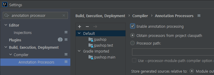 lombok 플러그인을 받은 후에 추가적으로 세팅해야하는 항목이 있다. Settings에서 Annotation Processors를 활성화 시키는 것이다. 아래에서 설정할 수 있다.