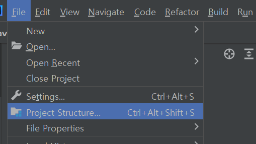 두번째 방법은 인텔리제이 상단 File > Project Structure 를 클릭하여 프로젝트 세팅창을 엽니다.