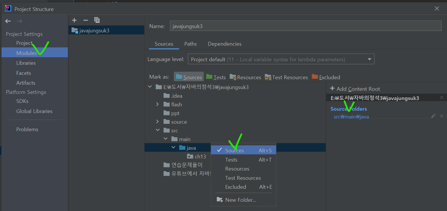여기서도 java 폴더를 우클릭해보면 Sources 항목이 체크되어있는데요. 앞서 설정한 것이 잘 적용되어 있는 것을 확인할 수 있습니다.