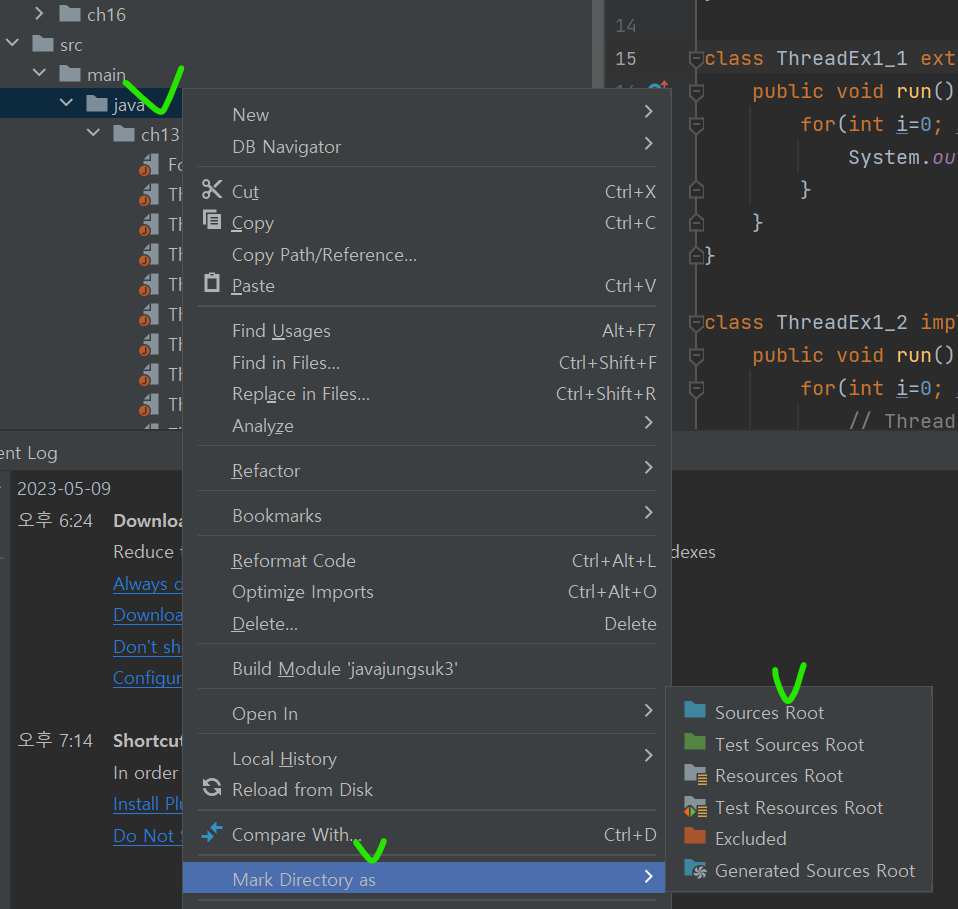 자바 폴더 우클릭하여 컨텍스트 메뉴 띄우기 > Mark Directory as > Sources Root 선택