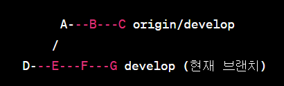 D 커밋에서 분기된 로컬 브랜치는 이후 E,F,G 커밋이 반영이되어있음. 분기된 이후에 리모트 브랜치에 반영된 B,C 커밋이 존재하는 상태