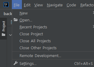 인텔리제이 창 왼쪽 상단의 File > Setting 메뉴를 클릭하여 아래 창을 띄웁니다.