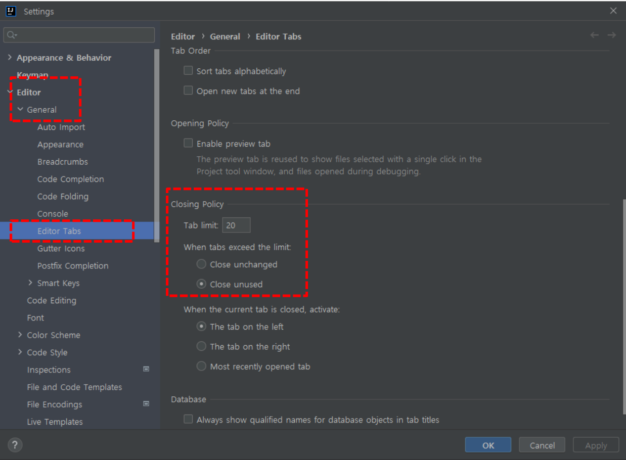 검색창에 Editor Tabs 또는 Editor > General > Editor Tabs 메뉴로 이동하기.