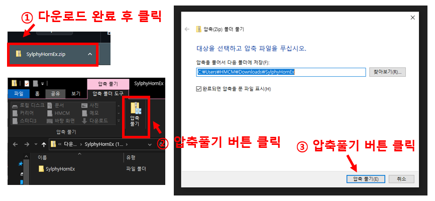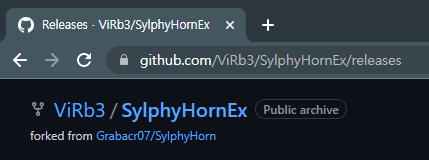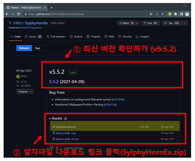 실행파일은 Assets 단락의 화살표 토글을 열어 SylphyHornEx.zip 링크를 클릭하여 다운로드해줍니다. 나머지 두개 파일을 해당 프로그램의 소스코드로, 빌드된 결과물만 다운로드하면 되므로 다운로드 하지않고 무시합니다.