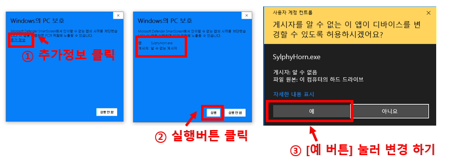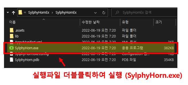 SlphyHorn은 별도 설치가 필요없는 프로그램입니다. 압축해제한 폴더를 열어 SlphyHron.exe를 실행하면 바로 프로그램을 사용할 수 있습니다.