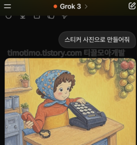 스티커 사진으로 만들어달라고 하면 어떻게 하려나 싶어서 했는데, 톤이나 선이 훨씬더 명료해진 것을 알 수 있습니다. grok으로 이런식으로 결과물을 만든 후에는 이미지를 클릭해 다운로드 버튼을 누르면 핸드폰에 저장을 할 수 있습니다.