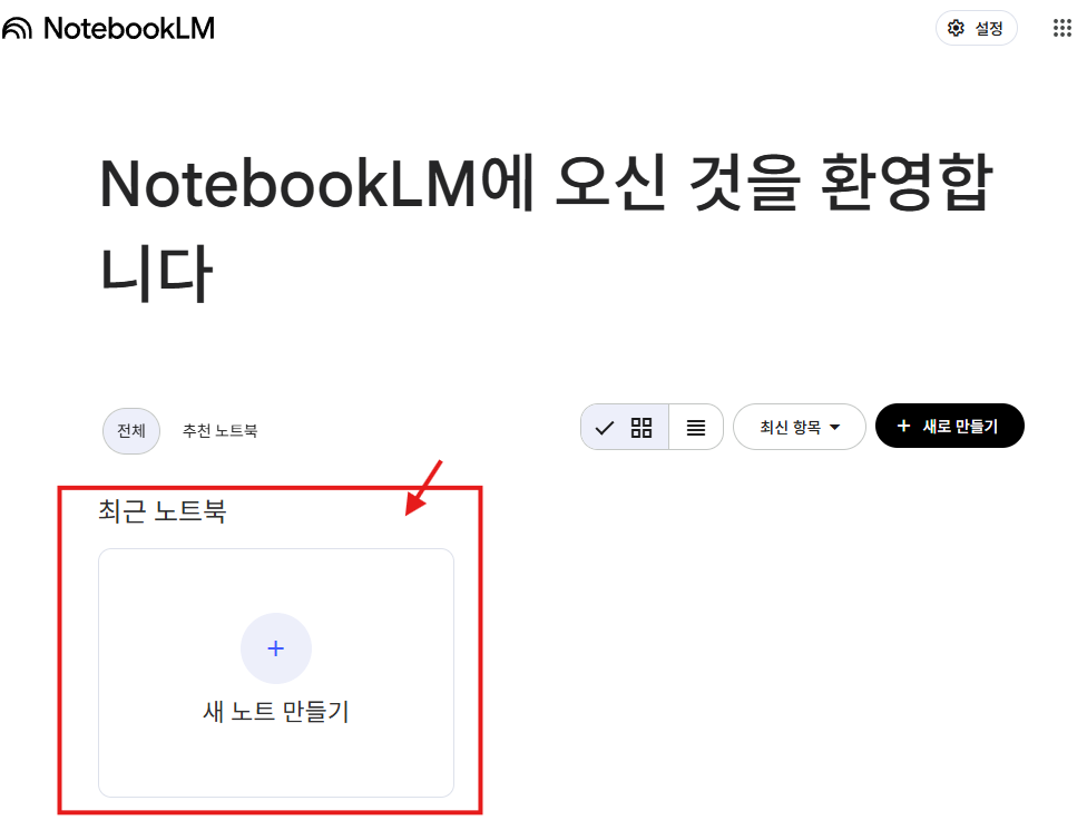 로그인을 마치면 NotebookLM 대시보드 화면이 나타난다.
