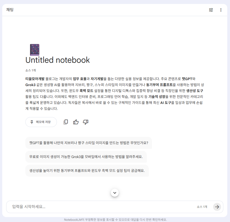 이렇게 하면 NotebookLM은 해당 블로그 글을 기반으로 내용을 이해하고 정리한다.