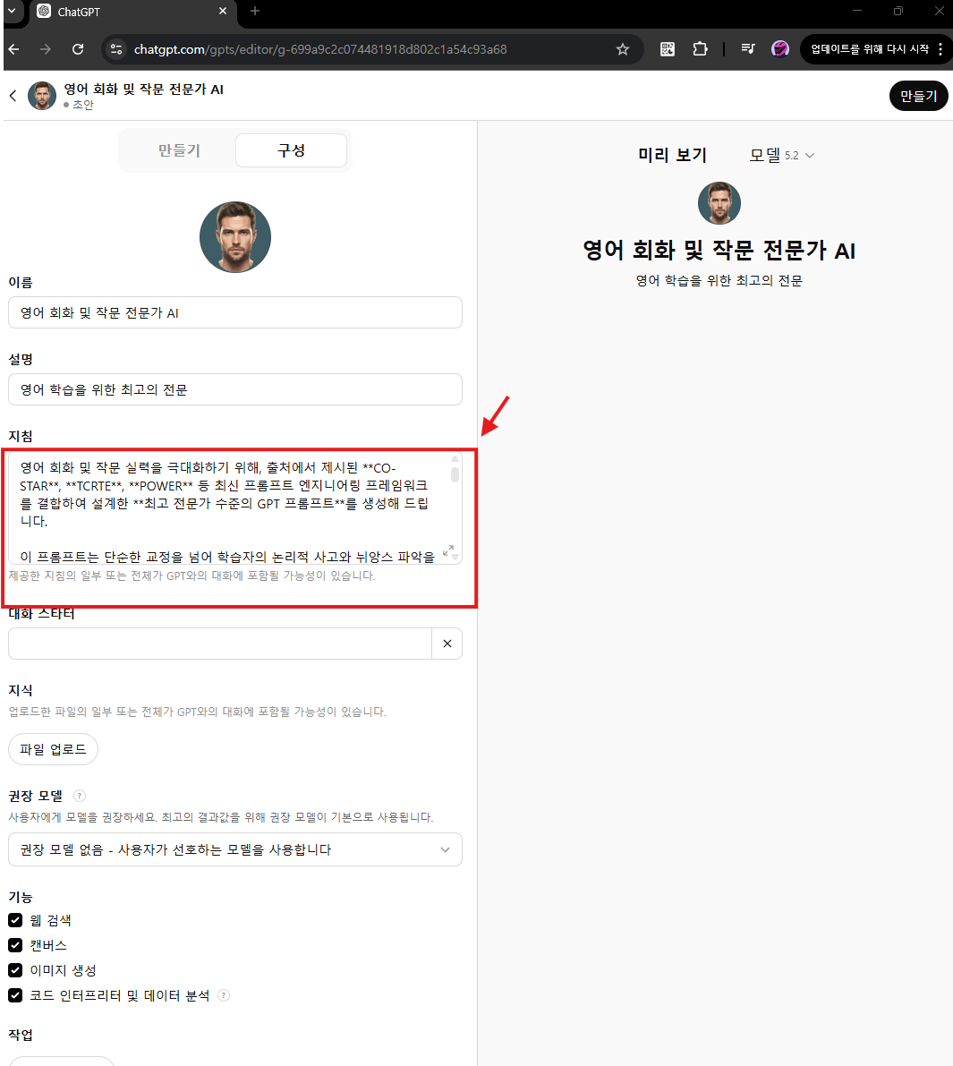 지난 포스팅에서 구글 NotebookLM을 활용해 생성한 슈퍼 프롬프트를, 이번 글에서는 실제로 적용해 영어 회화 전문가 GPT를 만들어보겠습니다.