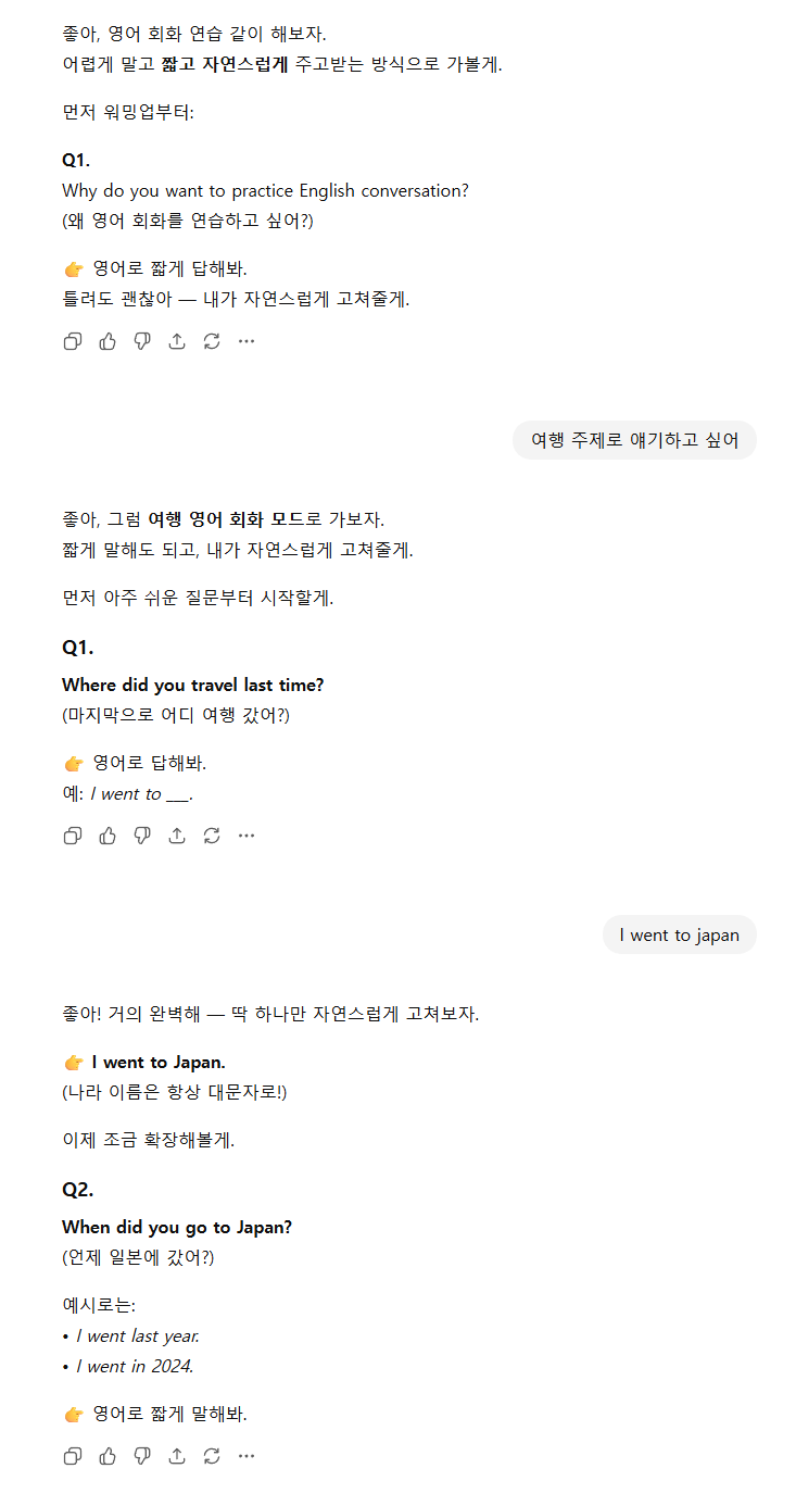 처음에는 일반 ChatGPT와 비슷해 보일 수 있지만, 대화가 이어질수록 기본 GPT는 맥락이 흐려지거나 피드백 구조가 무너지는 경우가 있습니다. 계속 프롬프트를 추가해도 딴소리를 하거나 엉뚱한 대답을 하는 경우가 발생합니다.