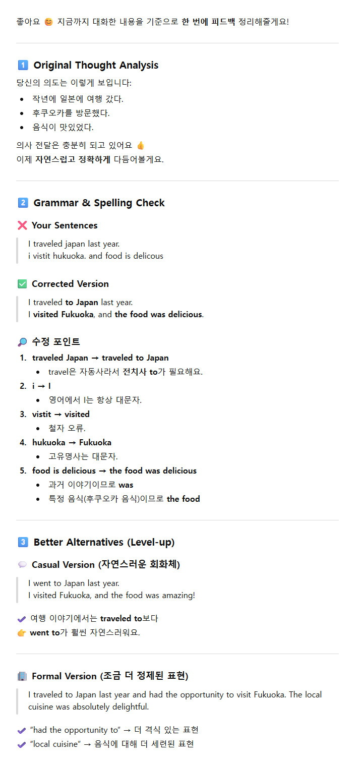 구조화된 피드백과 일관된 응답 형식을 유지하며, 문법·뉘앙스·표현 확장까지 포함한 정교한 분석을 안정적으로 제공합니다. 정말 사용자가 영어 학습을 하기 위한 맥락을 일관성 있게 유지할 수 있게 됩니다.