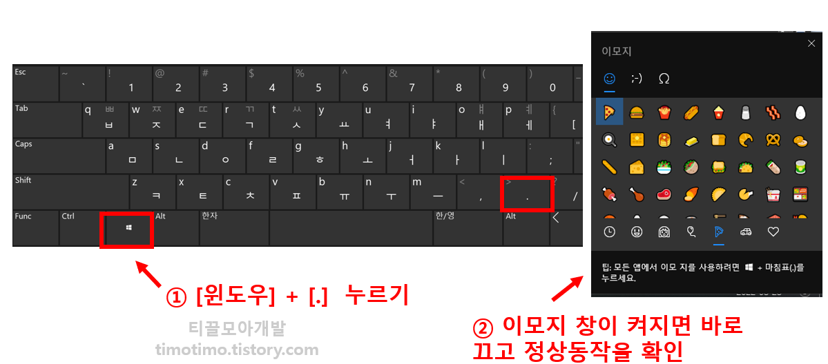 -> [Win] + [.] 키 또는 [Win] + [;] 키를 눌러 이모지창을 열었다가 닫아 해결합니다.