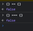직접 확인해보기 위해 먼저 빈 객체 두개를 비교연산자인 등호연산자를 사용하여 비교해보겠습니다.