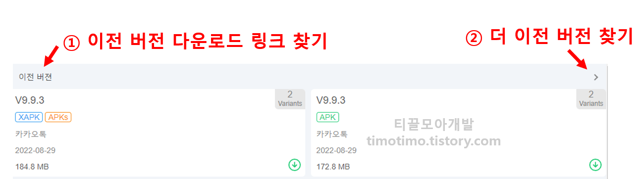 저는 카카오톡을 기준으로 한번 찾아보았는데요. 아래와 같이 바로 보이는 버전은 최신버전이고, 더 이전버전을 찾으려면 아래와 같은 버튼을 찾아 클릭합니다.