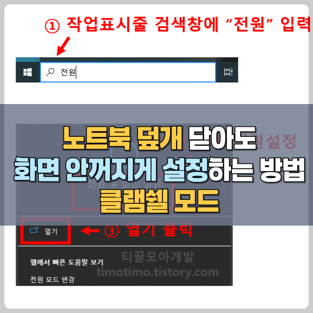 안녕하세요. 티끌모아개발의 티모티모입니다. 오늘 소개드릴 내용은 노트북을 덮어도 연결한 모니터 화면이 안꺼지게 설정하여 노트북을 데스크탑처럼 사용하는 방법입니다. 맥북에서는 이러한 방식으로 사용하는 모드를 클램쉘 모드라고 하는데요. 마치 조개가 입을 다물고 있는 모습 처럼 노트북을 덮개를 닫고도 컴퓨터를 사용할 수 있는 방식이기 때문입니다.