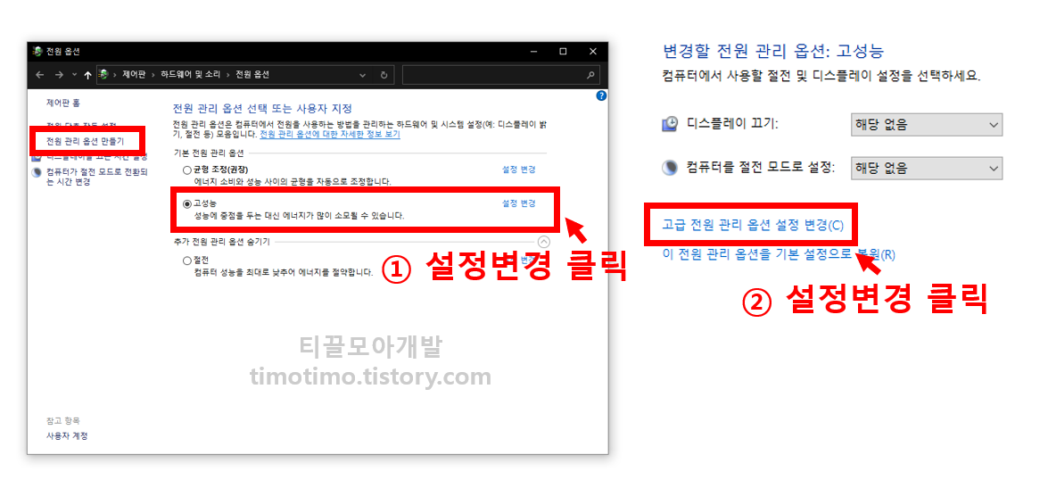 전 단계에서 설정을 변경했지만, 종종 설정이 적용이 안되는 경우가 생기는데요. 이를 대비해 추가 전원 설정에서 관련 설정을 한번 더 진행해 줍니다. 저는 전원옵션이 고성능을 설정했기 때문에 고성능 옆에 있는 "설정 변경" 버튼을 눌렀는데요. 독자님들은 사용하고자 하는 옵션 옆의 설정 변경을 눌러 주시면 됩니다. 새로운 옵션을 만들고 싶다면, 제일 좌측에 있는 전원 관리 옵션 만들기를 눌러 새로운 전원옵션을 만들어 설정 변경을 해주셔도 됩니다.