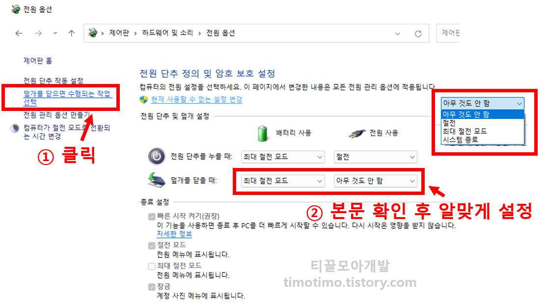 전원 사용시에는 덮어도 그대로 화면이 나오도록 아무 것도 안 함을 설정해도 좋습니다. 하지만 배터리 사용시에는 최대 절전 모드/ 절전모드/ 시스템 종료를 권장합니다. 배터리 사용 모드에 아무 것도 안함을 설정하면 덮어도 노트북이 절전되지도 않고 시스템이 종료되지도 않기 때문에, 덮고 무의식 중에 가방에 넣어버리면 가방 안에서 쿨러가 계속 돌면서 가방 안이 뜨거워져 위험한 상황이 발생할 수 있습니다. 그래서 그런 상황을 사전에 방지하기 위해 배터리 사용시에는 아무 것도 안함 설정을 하지 않는 것을 권장합니다.