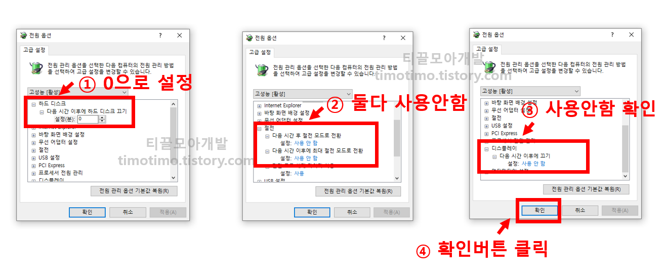 고급 전원 관리 옵션을 들어가 하드 디스크 끄기 옵션, 절전모드 옵션, 디스플레이 옵션을 3개를 설정합니다. 이미 설정이 되어 있는 경우에는 확인버튼을 눌러 완료합니다.