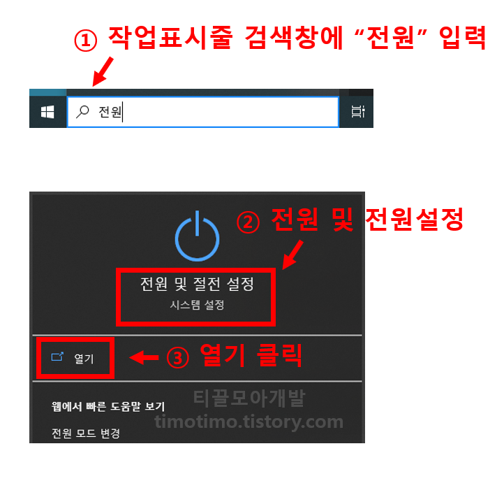 작업표시줄 검색창에서 "전원"이라고 입력하면 다음 화면처럼 전원 설정으로 들어갈 수 있습니다. 작업 표시줄에 검색창이 없다면 [Window]키 + Q 를 입력하면 검색창이 나옵니다. 입력창에 "전원" 또는 "전원 및 전원설정" 검색해서 클릭합니다.