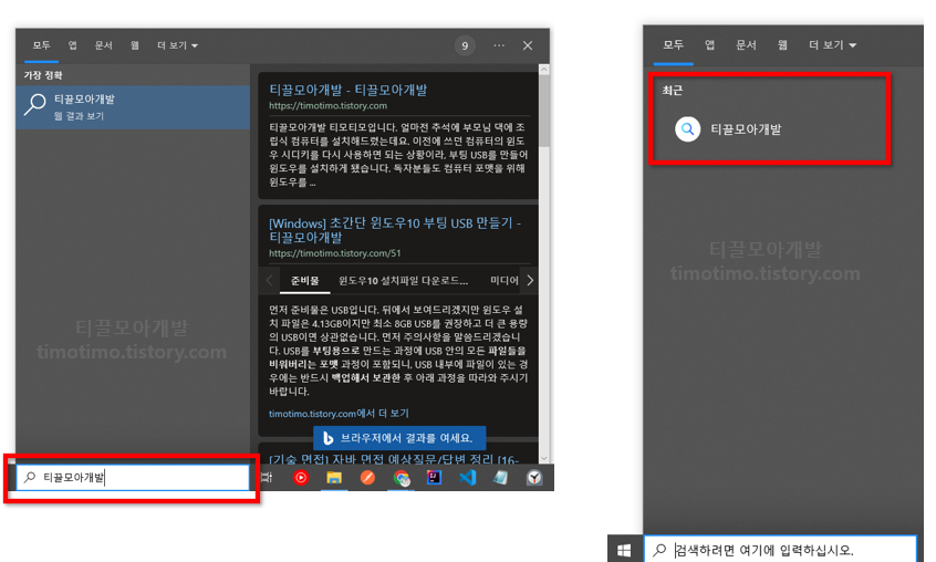 입력창에 마우스를 클릭하면 위 화면과 같이 검색창이 활성화 됩니다. 입력창에 검색어를 작성하면 내 컴퓨터에 있는 파일을 먼저 찾고 없으면 Bing 검색엔진을 이용해 해당 검색어를 검색하게 됩니다. 검색한 내용은 오른쪽 화면과 같이 기록이 남게 됩니다.