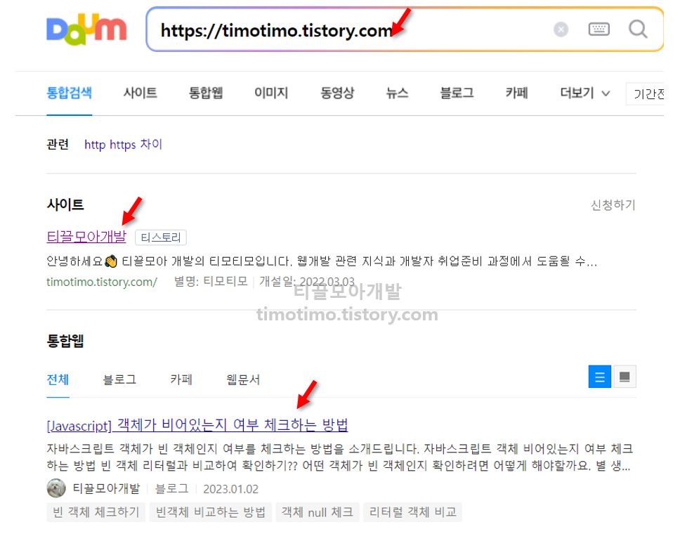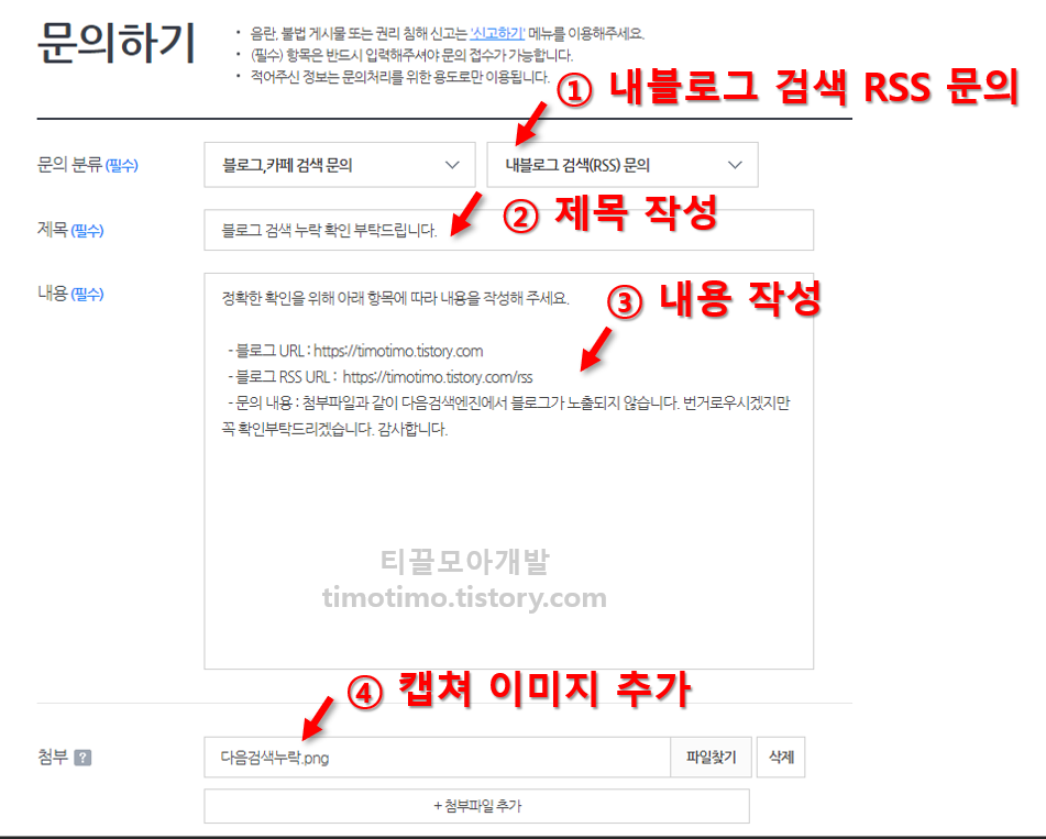 그리고 제일 하단의 첨부파일은 다음 검색창에서 각자 티스토리 주소를 검색하여 나오는 화면을 캡쳐해주시면 됩니다. 저같은 경우에는 https://timotimo.tistory.com 을 다음 검색창에 작성하여 나오는 화면을 캡쳐하여 첨부했습니다. 실제로 다음 검색엔진에서 티스토리 블로그가 검색누락되면 내 블로그에 대한 정보가 따로 표시가 되지 않습니다.