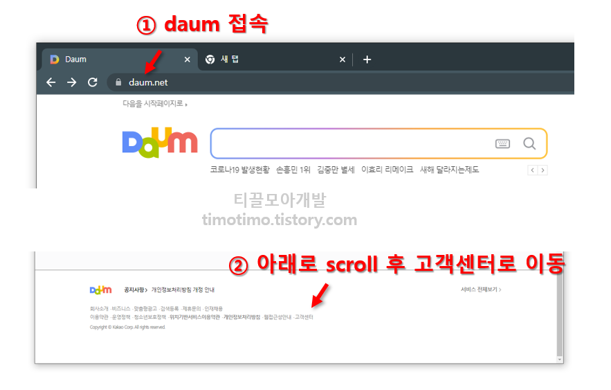 먼저 다음 포탈 사이트로 이동해 화면 제일 아래로 이동하여 고객센터 링크를 확인하여 이동합니다.