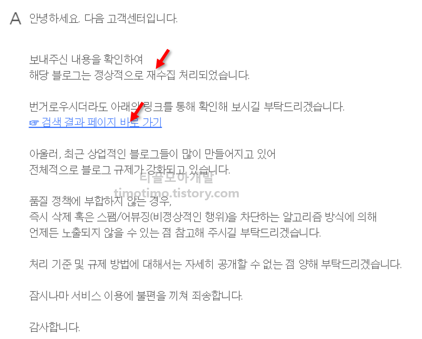 요렇게 바로 빠르게 답장을 받을 수 있었습니다. 그리고 뒤이어 바로 검색창에 제 블로그 URL을 검색한 결과 요렇게 정상적으로 등록된 것을 확인할 수 있었습니다.