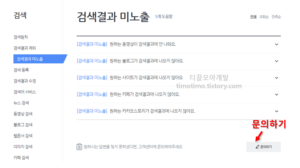검색결과 미노출인 경우의 질문/답변 리스트가 있는데요. 무시하고 오른쪽 아래의 문의하기 버튼을 클릭합니다. 꽤나 숨겨져있어 직접 찾는다면 찾기가 힘들 것 같다는 생각이 들었습니다.