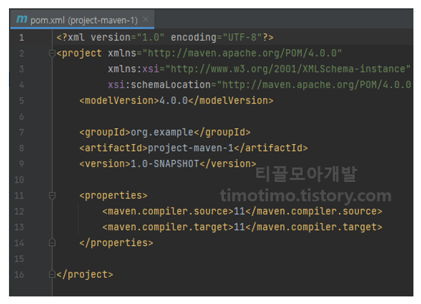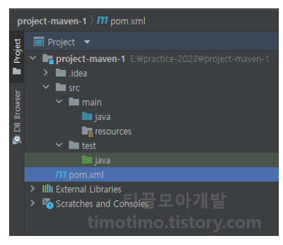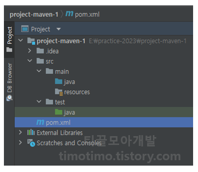 메이븐 프로젝트가 생성되면 좌측 사진과 같은 디렉토리 구조로 프로젝트가 자동으로 생성됩니다. .idea 폴더는 프로젝트관련 프로젝트 설정정보이고 아래 src 디렉토리에 main과 test로 나눈 기본적인 메이븐 프로젝트의 디렉토리 구조를 확인할 수 있습니다.
