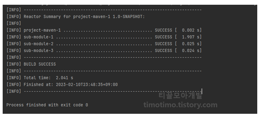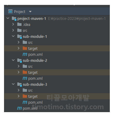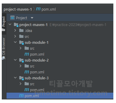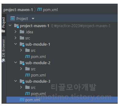 여기까지 하면 위와 같은 구조를 가진 메이븐 멀티모듈 프로젝트가 완성됩니다. 다음으로 이렇게 만든 멀티모듈 프로젝트가 정상적으로 빌드되는지 확인해보겠습니다.