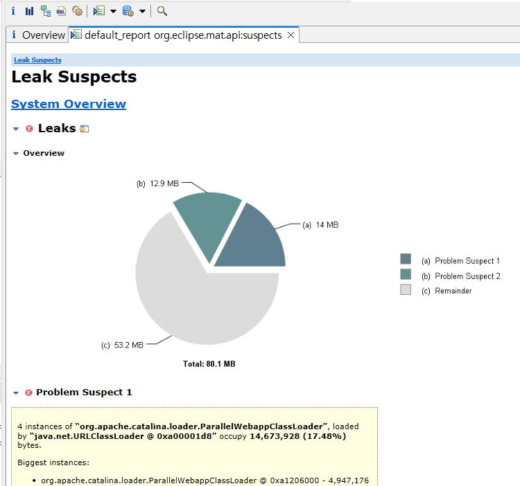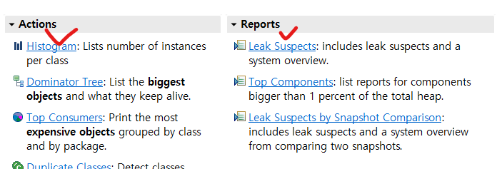 요렇게 heap dump 파일을 읽어 메모리 릭으로 의심되는 객체들에 대해서 언급하고 리포팅을 진행해준다.