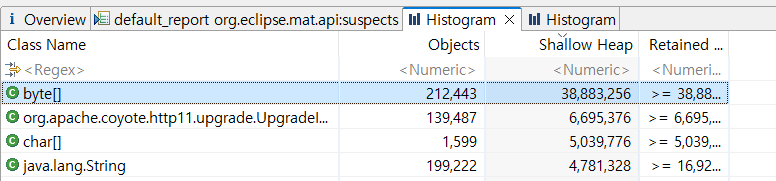 켜자말자 실행된건 오른쪽 Leak Suspects이고 다양한 방법으로 heapdump를 분석해볼 수 있지만 Histogram으로도 분석해볼 수 있다.