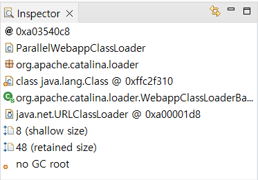 원형 그래프를 클릭해보면 좌측 상단에 자세한 조사창이 나오는데, 해당 객체의 클래스와 메모리 주소등등 정보들이 나온다. 제일 하단에는 no GC root가 적혀있는데 해당 객체가 GC root로부터 도달할 수 없는 객체라는 의미로 대상 객체를 어떤 객체도 참조하지 않는 경우를 의미한다. 따라서 No GC root는 MAT에서 메모리 누수를 의심할 수 있는 객체들을 수집하는데 중요한 지표 중 하나인 것으로 보인다.