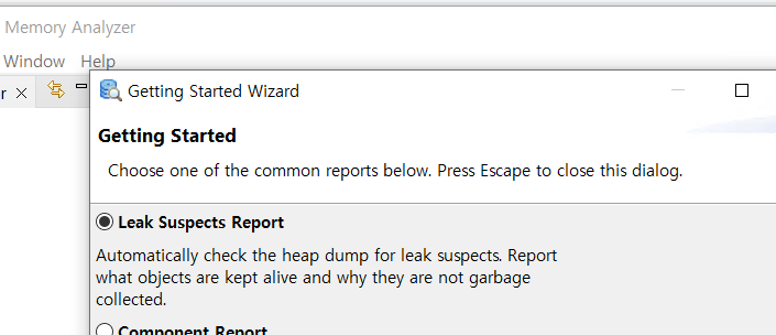 파일을 열면 이렇게 바로 해당 heapdump의 메모리 릭에대한 리포트를 확인할 것인지 여부를 묻는다. 체크하고 Finish 버튼을 클릭하면 된다. 클릭하지 못해도 이후 버튼에서 확인할 수 있다.