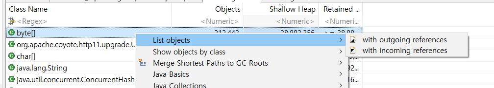 with incoming references : 대상 객체를 참조하는 다른 객체들을 보여줌
