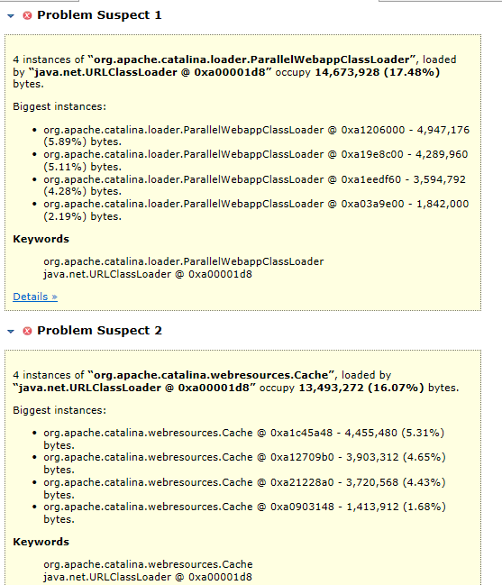 이 heapdump 같은 경우에는 MAT이 단일 인스턴스가 가장 큰 크기를 가진 인스턴스의 클래스를 용의선상에 올렸는데 두 클래스는 톰캣에서 사용하는 클래스로더와 정적 리소스 캐시를 위한 클래스였다. 이 경우에는 JVM에서 관리하는 인스턴스이고 위 두 클래스가 로딩하고 캐시하는 객체가 메모리릭의 원인이 될 순 있지만 대상 객체가 원인이 되기는 어려워 보였다.