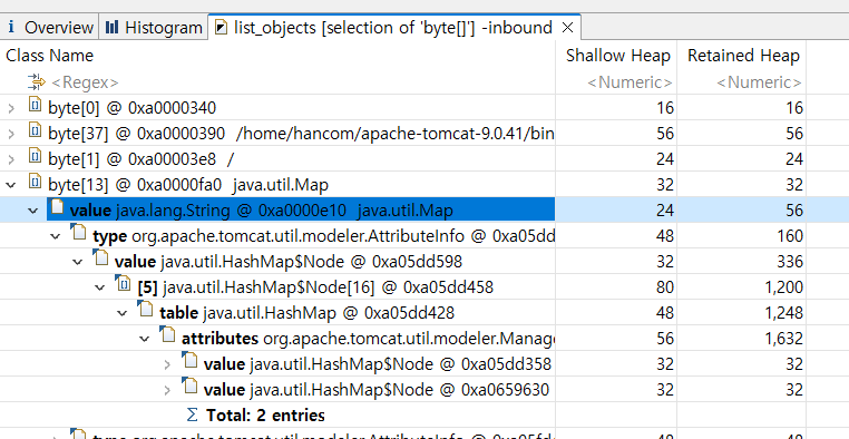 크기 내림차순으로 정렬되어 있는데 Shallow Heap은 대상 클래스 메모리 그 자체를 의미하고 단위는 byte이다.